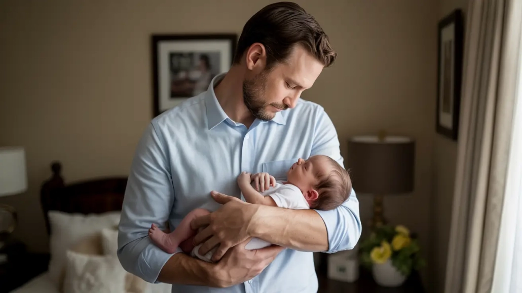 For slightly older newborns with some neck control, the over-the-shoulder peek creates adorable images with personality. With baby resting on dad’s shoulder, capture the moment when they lift their head slightly, creating a “peeking” effect. These images often capture surprising alert expressions and wide eyes.